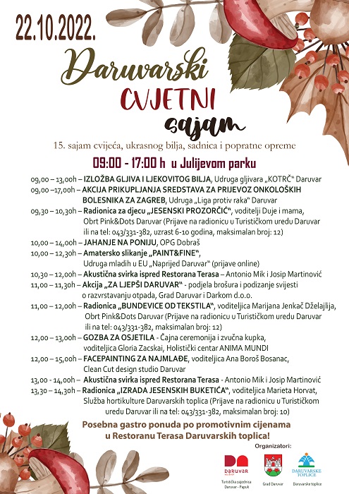 Daruvar je oduvijek grad parkova i prekrasnog očuvanog zelenila od centra grada pa sve do Petrovog vrha. Daruvar je grad s najviše osvojenih Zelenih cvjetova s titulom najuređenijeg malog grada kontinentalne Hrvatske. Uređeni parkovi nisu samo mjesto za odmor i opuštanje već su i idealna kulisa za održavanja raznih događanja poput Cvjetnog sajma u sklopu kojega sudjeluju razni izlagači s rukotvorinama, domaćim proizvodima i cvjećari pa je uživanje posjetitelja višestruko. Jesenski Daruvarski cvjetni sajam održava se 22. listopada od 09,00-17,00h upravo na površini Lječilišnog perivoja Julijevog parka Daruvarskih toplica. U takvom okruženju su ljepota i šarenilo izloženog cvijeća i ukrasnog bilja izraženiji, a razne rukotvorine i domaći proizvodi primamljiviji i ukusniji. Program sajma obogaćuju razne kreativne radionice za odrasle i najmlađe, mogućnost jahanja na poniju, edukativna izložba gljiva i ljekovitog bilja, akustična svirka domaćih glazbenika i pomno odabrana gastro ponuda u Restoranu Terasa.