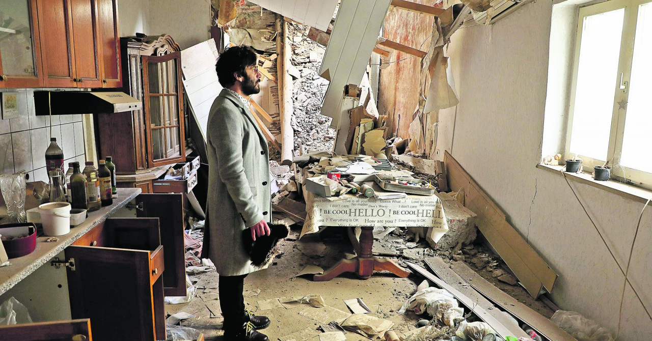 U stanu od pedesetak kvadrata je poplava, komad stropa odlomio se i pao je ukoso na kuhinju. Stojimo u lokvi u porušenom stanu i razrogačenih očiju promatramo nebo. Zatim se osvrćemo po stanu. Tu su krevet, ormari, čak i jedna lijepa komoda. Kožne fotelje. Odjeća i obuća po podu. Nečija četkica za zube i ključevi odloženi su na malom ormariću na ulazu u stan. Pokraj tave na štednjaku stoji boca maslinova ulja i narančina soka. Teško je zaključiti je li to ostavio neki skvoter, ili nesretnik kojega je strašni potres iz ožujka zatekao pri kuhanju.