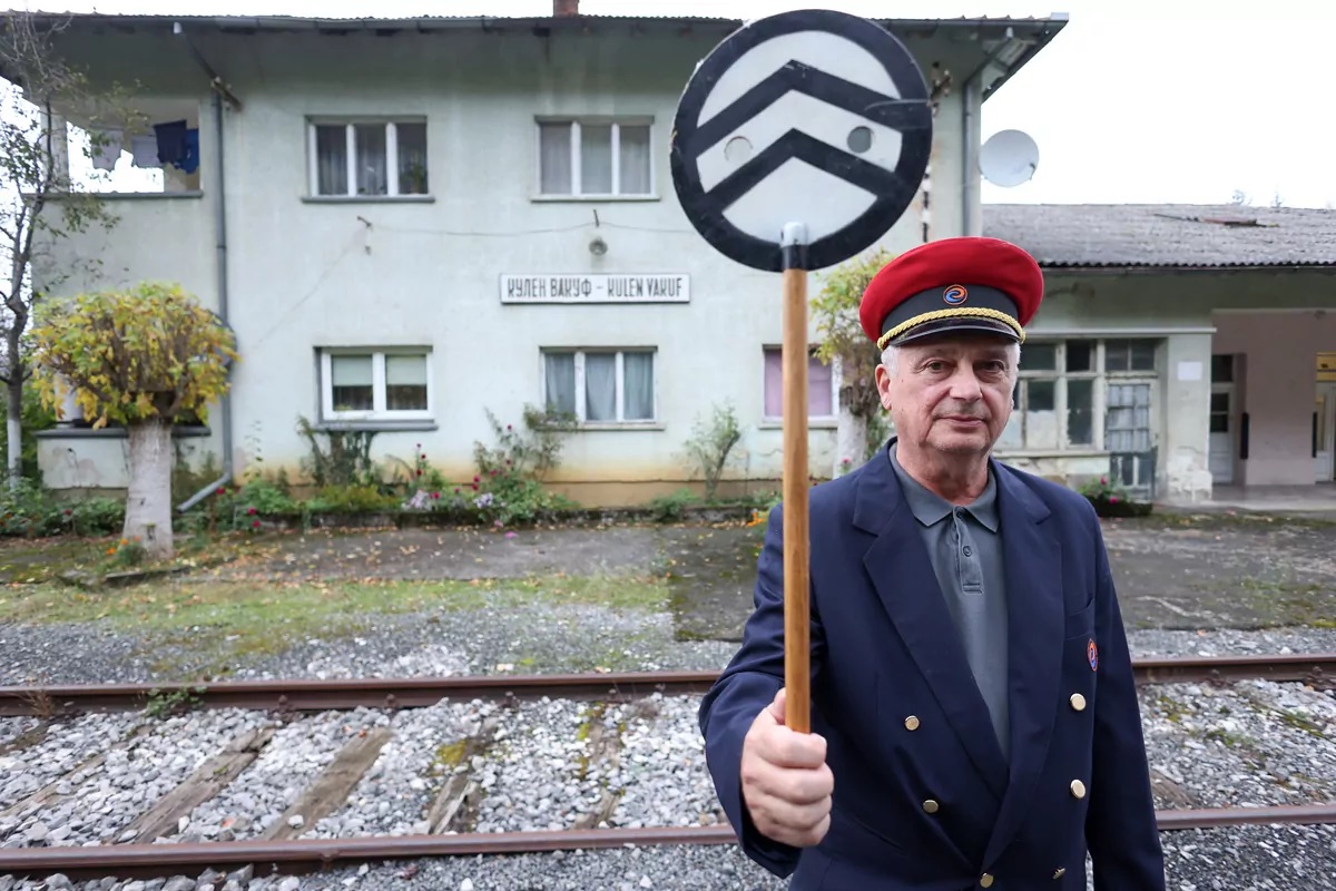 Potom uzme palicu i zviždaljku, ponovno stavi kapu na glavu i demonstrira pred nama pripremu za zaustavljanje i polazak vlaka. Iza toga nudi nas pićem.